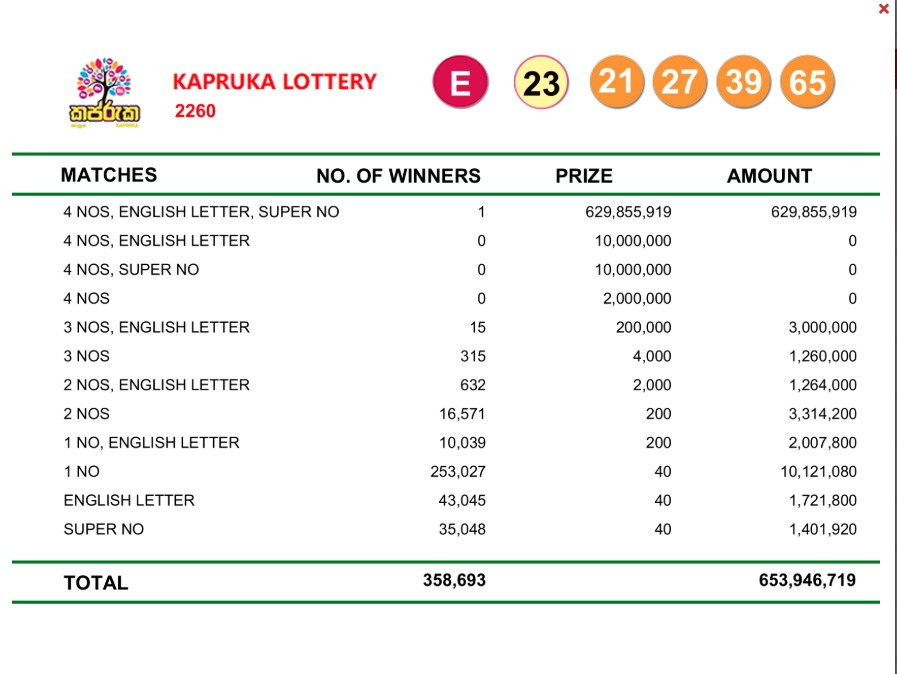 இந்த சீட்டிழுப்பில் 62 கோடியே 98 இலட்சத்து 55 ஆயிரத்து 919 ரூபாய் வெல்லப்பட்டுள்ளது.